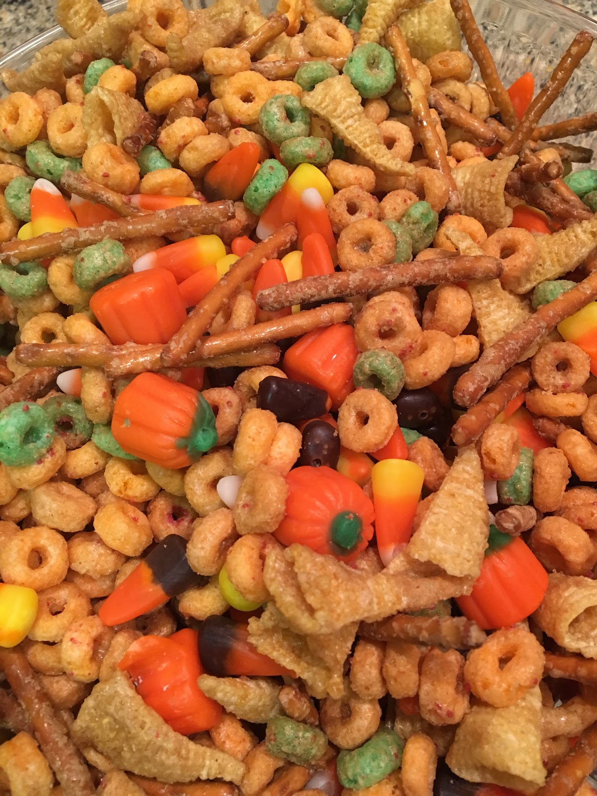 Once it is out and cooled you stir in the candy corn. She calls for an Apple flavored candy corn. I couldn't find it at my grocery store so I just used regular and it turned out fine. I know some people have an aversion to candy corn and you could totally leave it out. I know this because while I was waiting for it to cool I may have eaten a couple of handfuls before stirring in the candy corn.